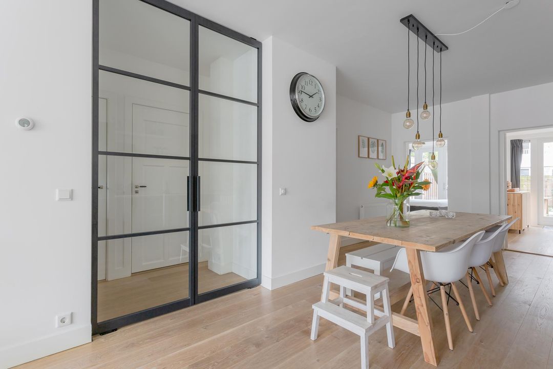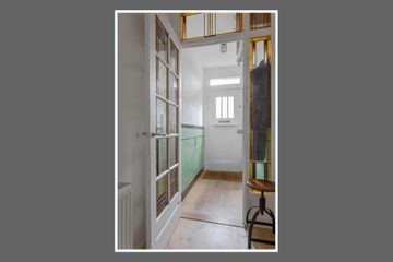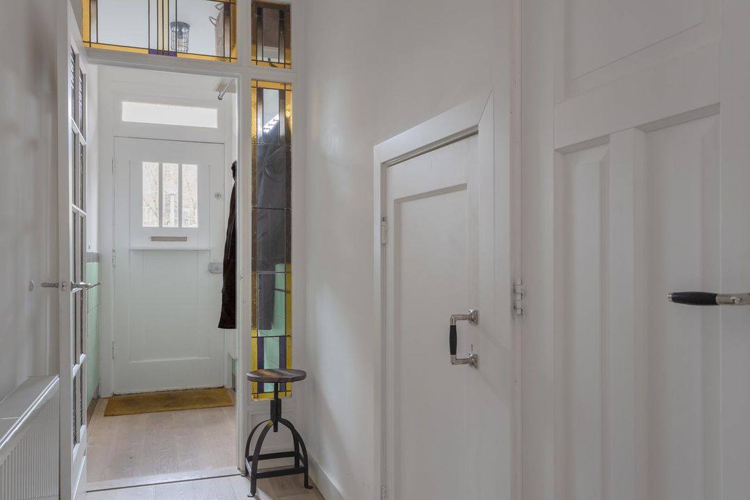 Eigen entree, binnenkomst in de prachtige hal met oude muurtegels en glas in lood ramen in de deur. In de gang bevindt zich een trapkast met bergruimte, kast met wasmachine/droger aansluiting en het separaat toilet. De woonkamer ligt aan de voorzijde en is voorzien van een sfeervolle schouw en originele erker. De prachtige moderne open keuken beschikt over een 5- pits gasfornuis, afzuigkap, vaatwasser, koelkast en vriezer. Ook is er genoeg werkruimte en veel kastruimte.
