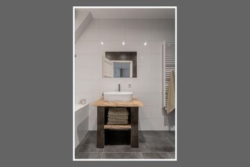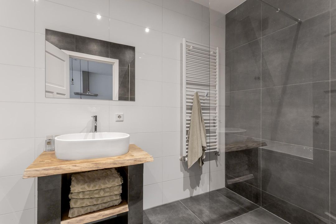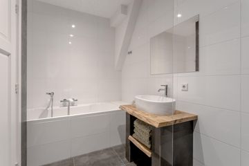 Vanuit de keuken zijn de twee slaapkamers te bereiken, aan de linker kant de master bedroom met ingebouwde kast en openslaande deuren naar de heerlijke tuin. De tweede slaapkamer is een fijne kamer met ook weer openslaande deuren naar de tuin. De badkamer is modern en strak en beschikt over een ligbad, inloopdouche, badkamermeubel, spiegel en handdoekenradiator.