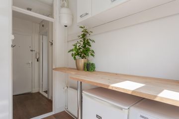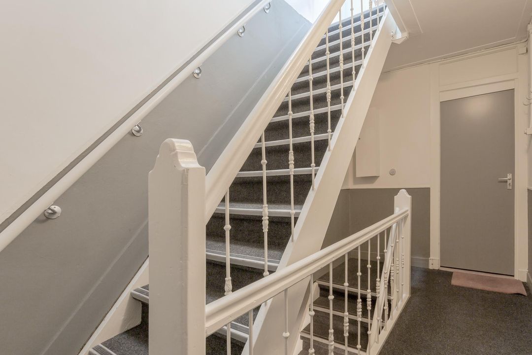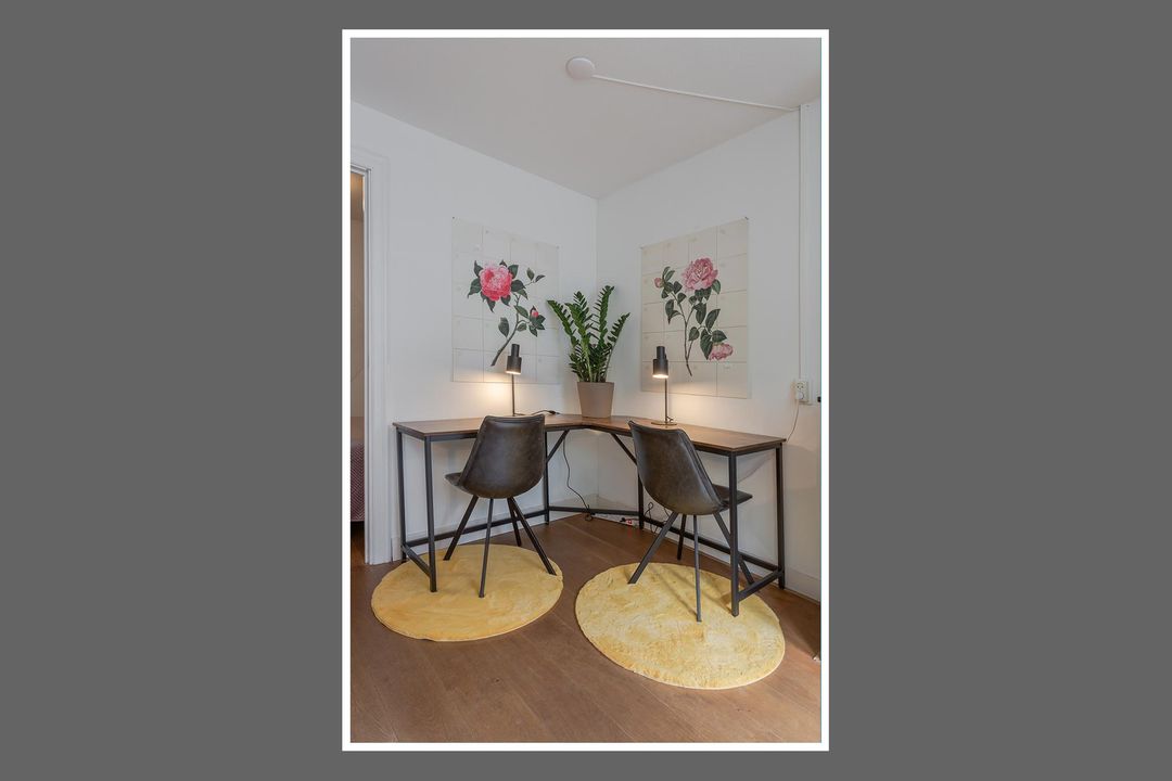 Via het gemeenschappelijk trappenhuis naar de eerste verdieping. Binnenkomst in de hal, voorzien van garderobe en toegang tot de woonkamer. De woonkamer heeft openslaande deuren naar het zonnige Franse balkon op het zuiden aan de voorzijde. Er is een zithoek met schouw, ruimte voor een eettafel én er is een fijne werkplek gecreëerd.