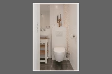 Aan de hal ligt de badkamer waar je beschikt over een inloopdouche met stortdouche, wastafelmeubel en toilet.