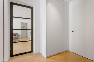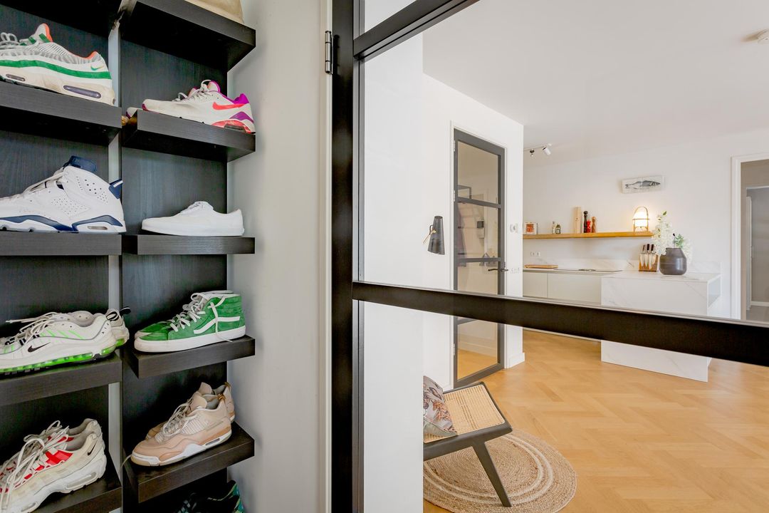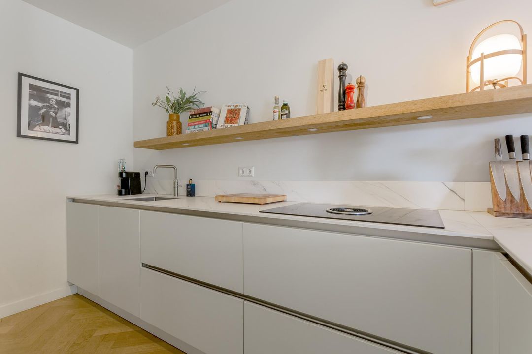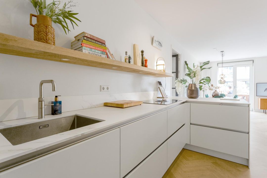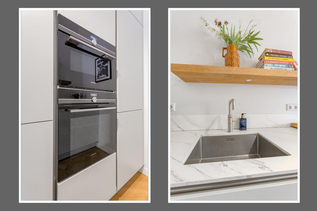 Entrance through the communal entrance on the ground floor. Once there you enter the hall where the toilet is located, through the beautiful glass doors there is access to the spacious living room with lots of light, double doors to the garden, and the luxurious open kitchen. The kitchen is equipped with an induction hob (from the Bora brand) with extraction in the middle, an oven, microwave, a large fridge, a dishwasher, a Quooker, plenty of storage space, and a ceramic worktop with a marble look. The bedrooms can be reached on both sides of the living room, on the left are two bedrooms, a bathroom, and a laundry/storage room. The two bedrooms, one of which is very spacious with a washbasin with a mirror, both have access and a view of the garden.