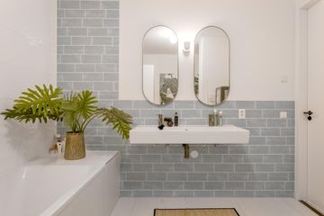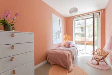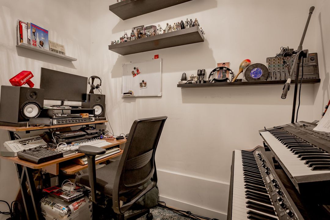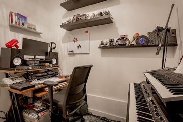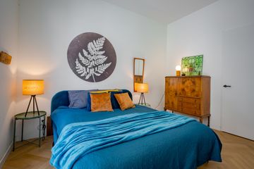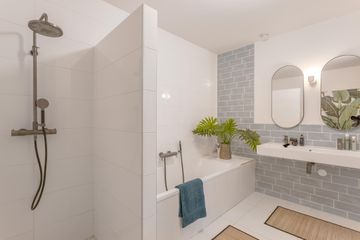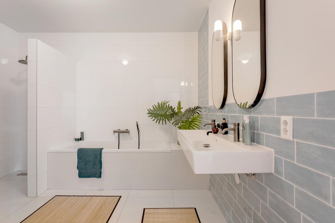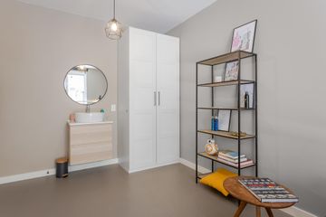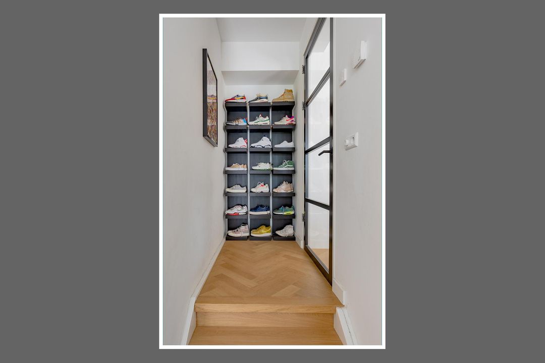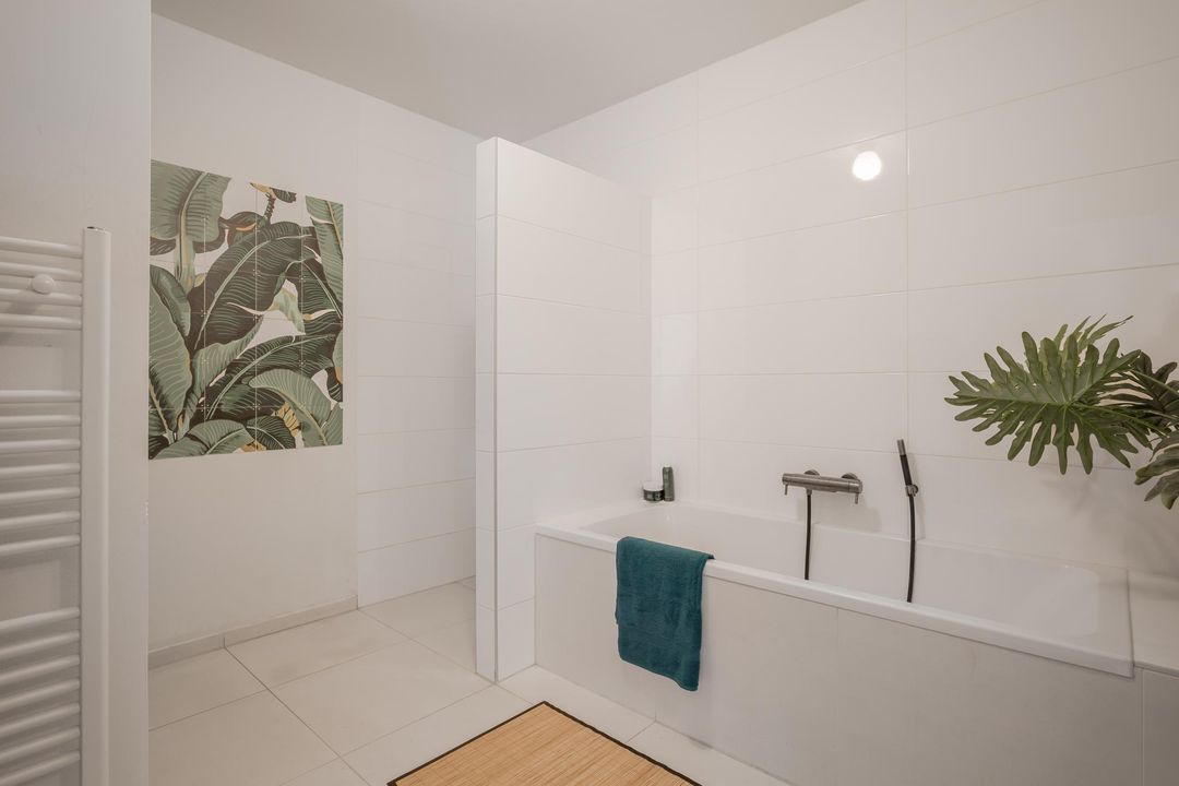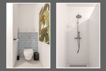 The very spacious bathroom is modernly tiled and has a double sink, double oval mirrors, a bath, a walk-in shower with a rain shower, and a toilet. Next to the bathroom is a laundry room/storage room where the washing machine and dryer connection is, there is also room for an extra freezer. On the other side of the living room is the largest bedroom with (a music) studio, this room can be reached via a small staircase and has a ceiling height of 3.15 meters. As with the other two bedrooms, the garden can also be reached through this room. The studio has plenty of storage space and is also ideal for use as a (walk-in) wardrobe.