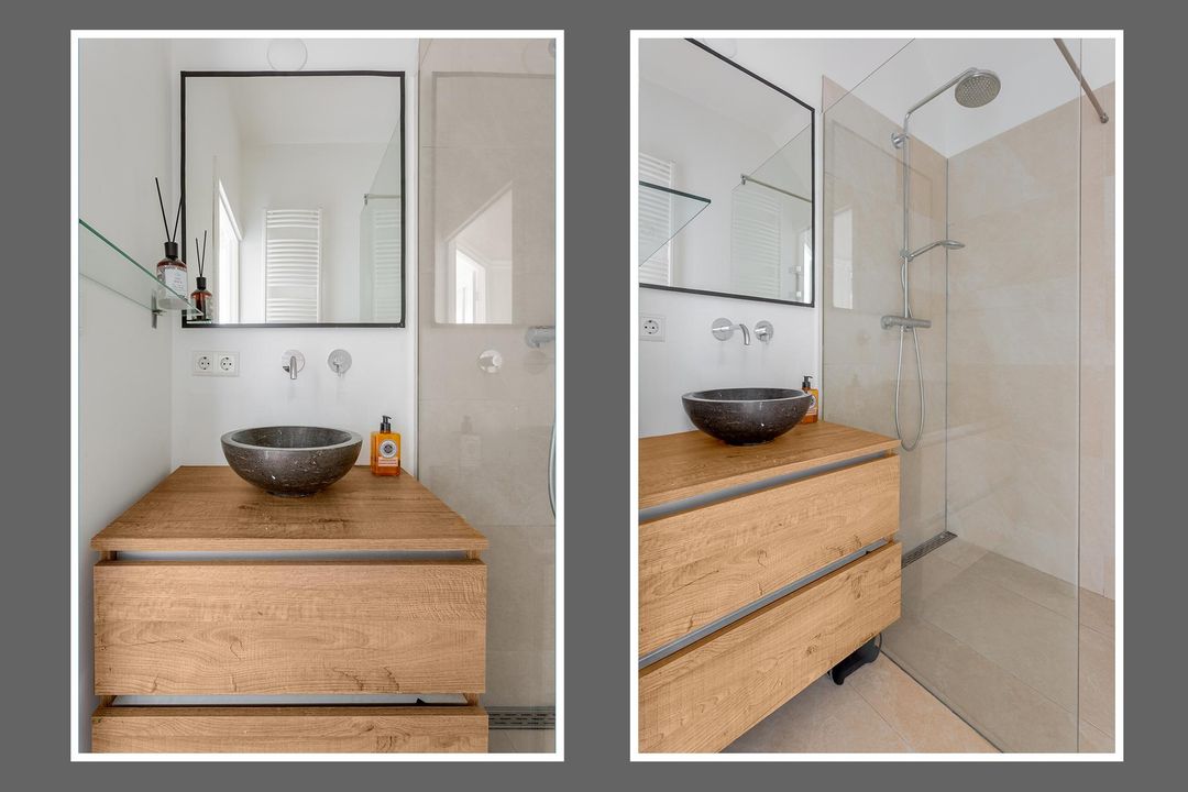 Bathroom located in the middle, a modern bathroom with a spacious walk-in shower, washbasin with furniture, mirror and a towel radiator. Next to the bathroom there is a separate toilet. There is also a storage cupboard where the washer/dryer setup is located.
