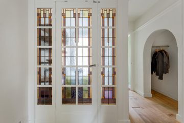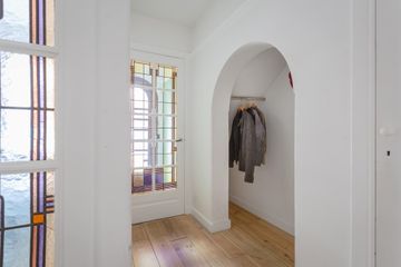 Entrance through the private front door from the street, the beautiful original stained glass door is still present in the porch. All rooms can be reached from the hallway, the attractive living room is located at the front of the house and is a spacious and pleasant room with an original fireplace. The kitchen is located at the rear, which can be closed by the en suite doors. The lovely kitchen is a cozy place for a combination of cooking and dining, a neat kitchen with a dishwasher, 5-burner stove, oven, drawers, refrigerator and a freezer. Through the patio doors to the beautifully adjacent garden on the east where you can enjoy the morning-afternoon sun. The ground floor apartment has 3 bedrooms, 2 at the rear, both of which also have access to the garden and have lots of light. The bedroom at the front also has beautiful characteristic stained glass doors.