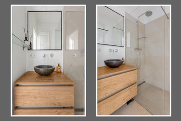 Badkamer gelegen in het midden, een moderne badkamer met een ruime inloopdouche, wastafel met meubel, spiegel en een handdoeken radiator. Naast de badkamer is er een apart toilet. Ook is er een bergkast waar de wasmachine/droger opstelling gesitueerd is.