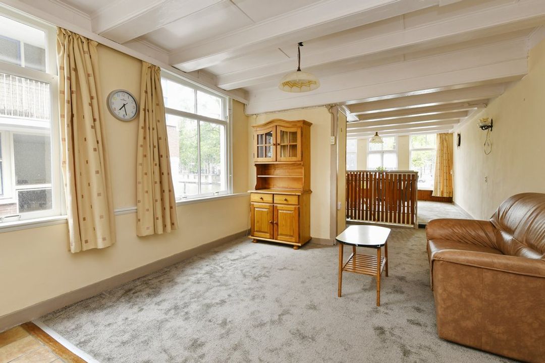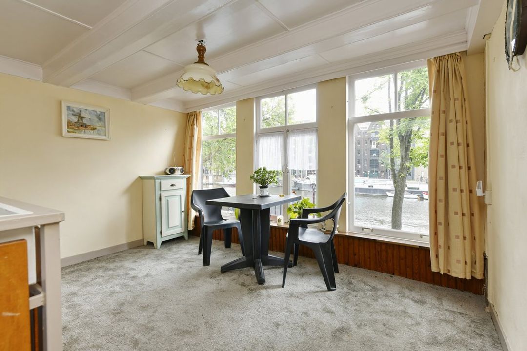 Bel-etage, entree aan grachtzijde, kleine voorkamer, achterkamer met wastafel en gaskachel. Trap naar eerste verdieping.
