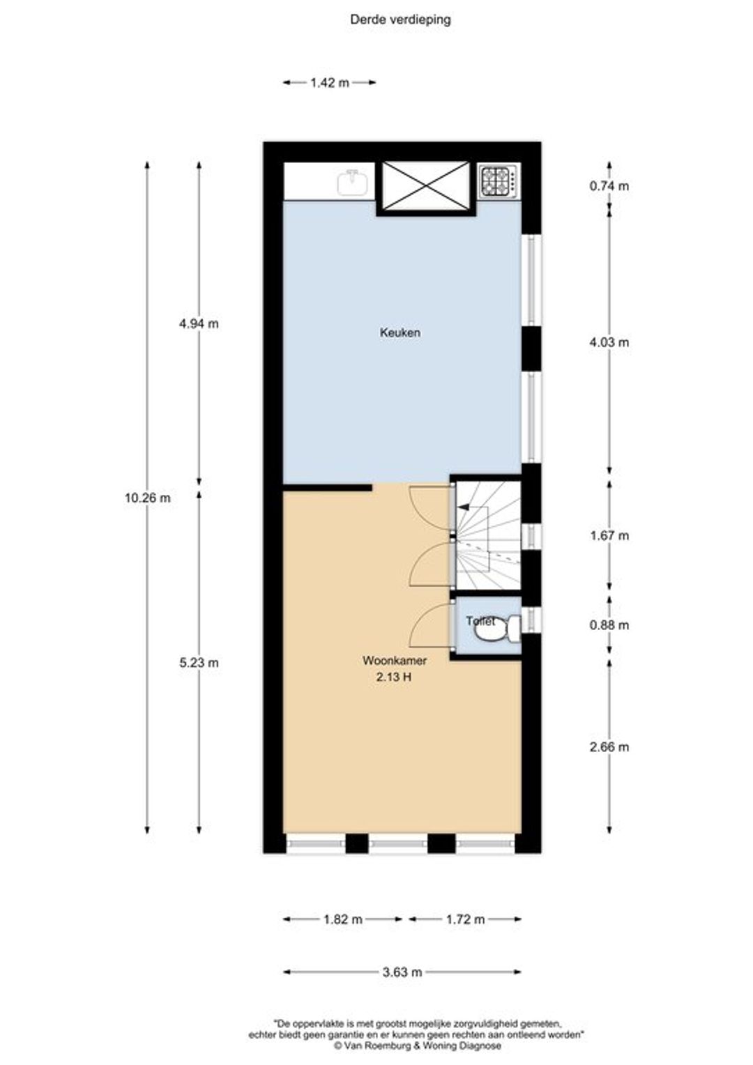 Derde verdieping, Keuken en woonkamer, tevens een toilet.