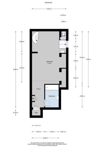 Souterrain: circa 43 m², plafondhoogte circa 1,76 meter;