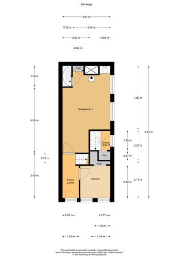 Bel-etage t/m derde verdieping circa 36 m² per laag, plafond hoogte varieert tussen de 1,95 en 2,27 meter;