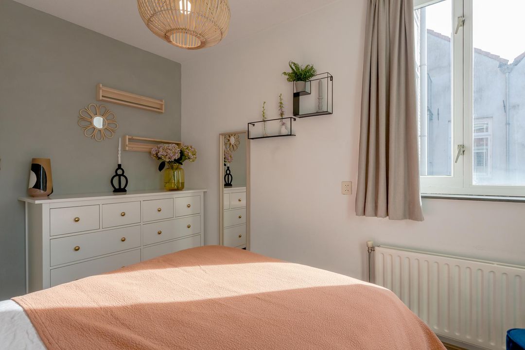 Ook de slaapkamer ligt aan de rustige achterzijde van het appartement en is een heerlijk licht vertrek, met eveneens een deur naar het balkon. De badkamer is voorzien van een douche, wastafelmeubel, spiegelkast, toilet en wasmachine-aansluiting.
