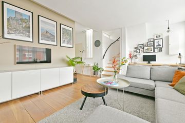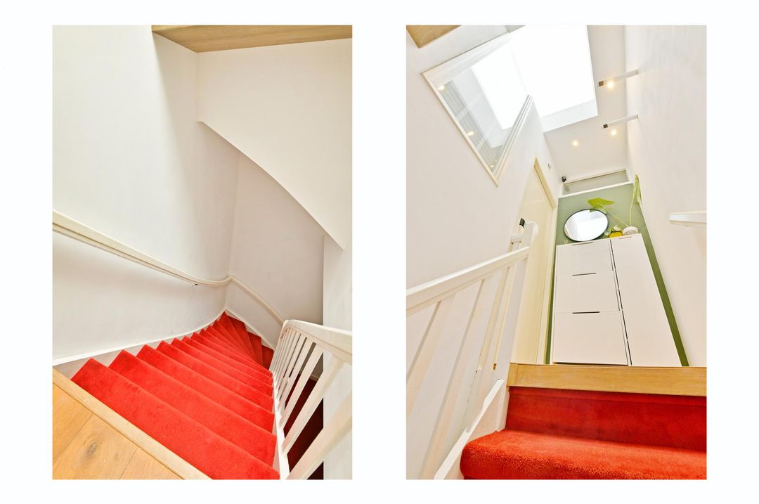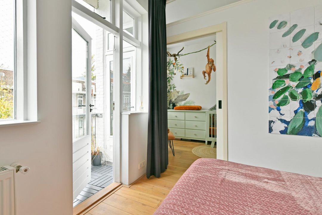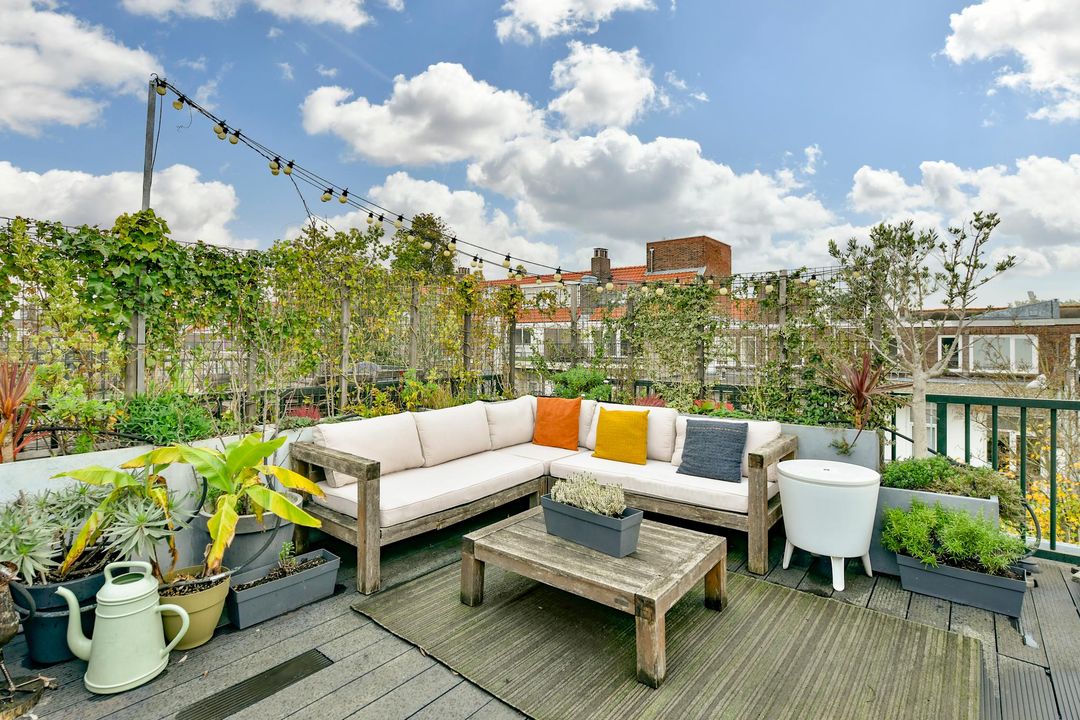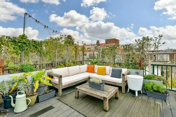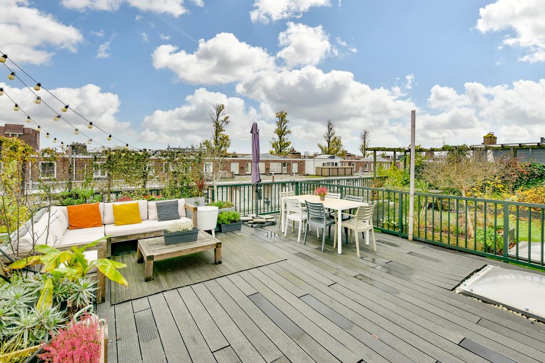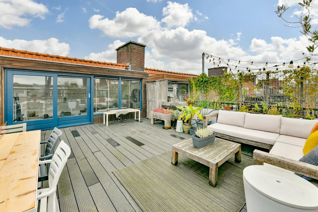 Light and nice double upper house on its own ground (approximately 69 m²) with a large roof terrace adjacent to the kitchen, but also a balcony at the bedroom. All this in one of the most beautiful streets of the Hoofddorpplein neighbourhood. In short, a lovely house in a perfect location! On the third floor the attractive living room, 2 bedrooms, bathroom and balcony, on the fourth floor the open kitchen with dining area and sliding doors to the adjacent and sunny roof terrace of approximately 36 m². The house is finished with black details, built-in spots and an oak wooden floor (parquet parquet), which gives the house a luxurious look.